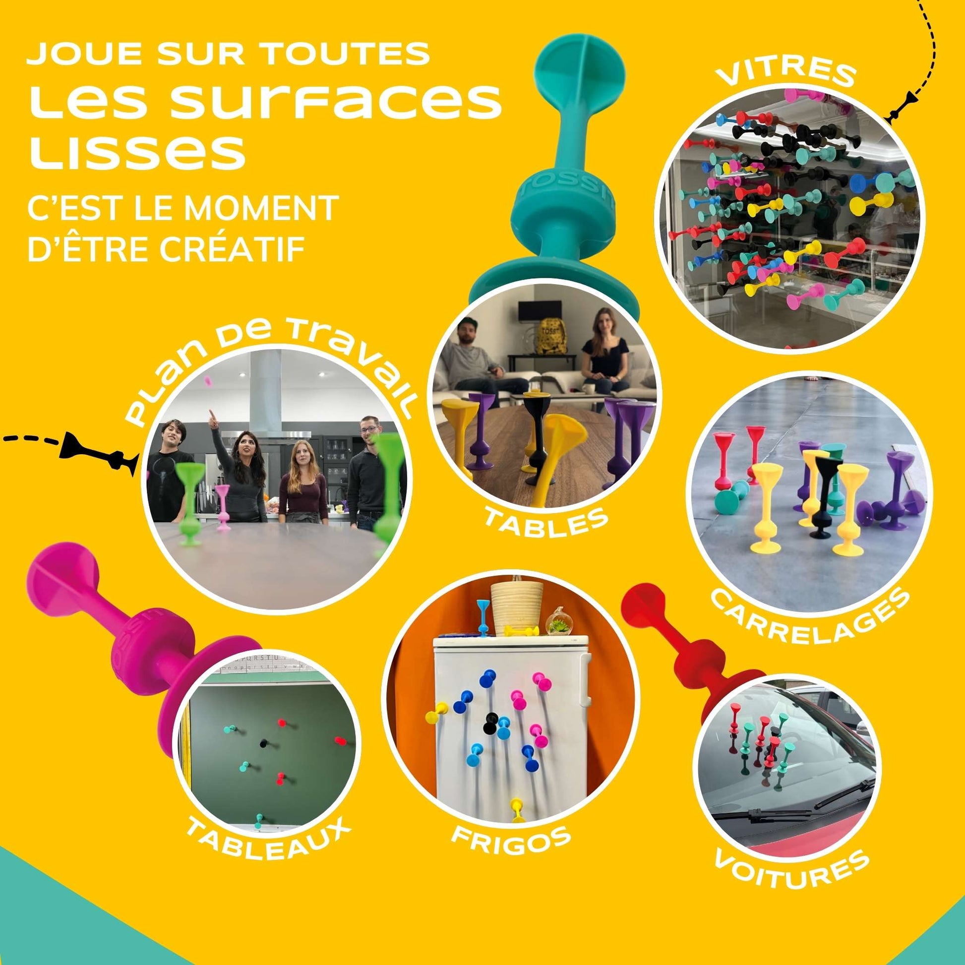 TOSSITは、床、窓、カウンターなど、滑らかな表面にくっつくように設計された 強力な吸盤付きのソフトダーツを使用する、天才的で楽しいダーツゲームです。屋内でも屋外でも、ご家族やお友達と一緒に遊べる9種類のゲームが付属しています。